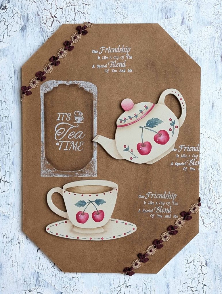 ポットとカップのカットアウトウッドにチェリーをペイントしてティータイムボードを作ります。