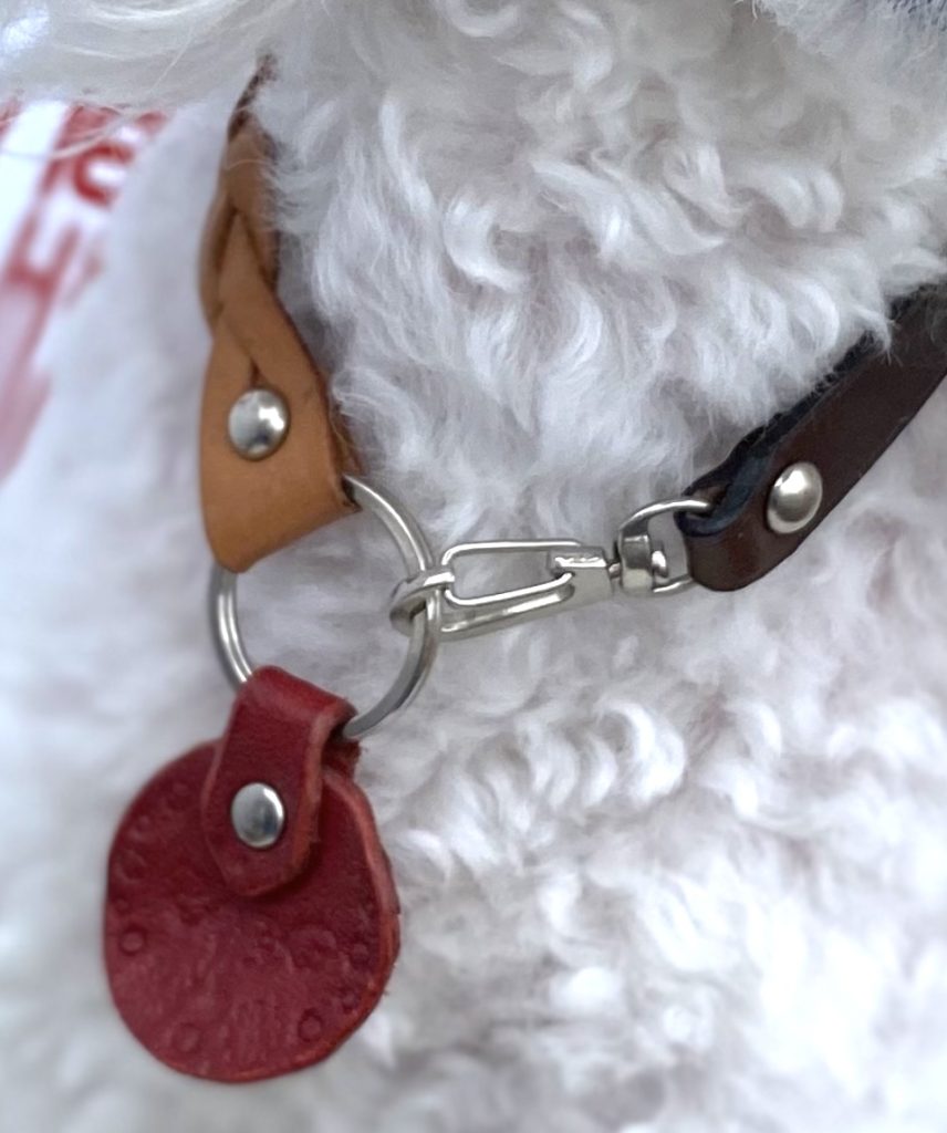 室内はもちろん首輪と一緒に着けても軽いから負担なし。手作りタグも個性的です。
