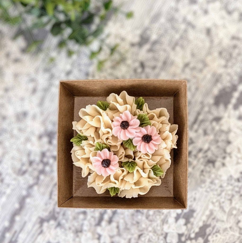 八丁味噌でほんのり色づいたフリルとピンクの秋桜が上品なおはぎ