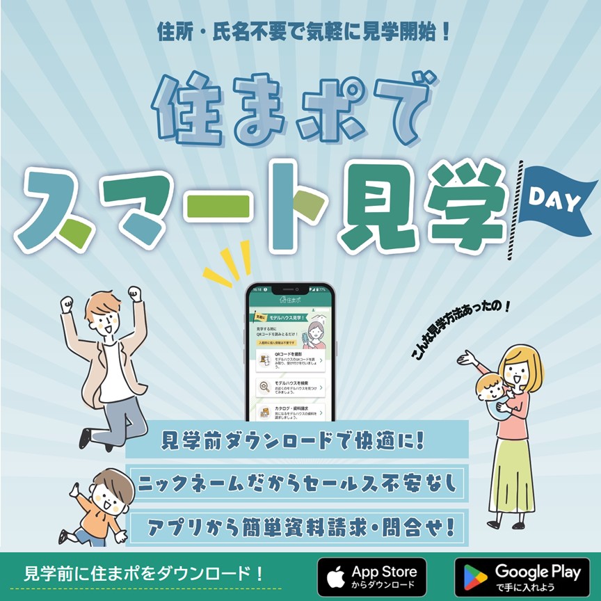 住まポを使えば、モデルハウスの入り口で毎回アンケートに答える必要はありません。見学前に住まポアプリをダウンロードして、モデルハウスにあるQRコードを読み込むだけで見学OK!