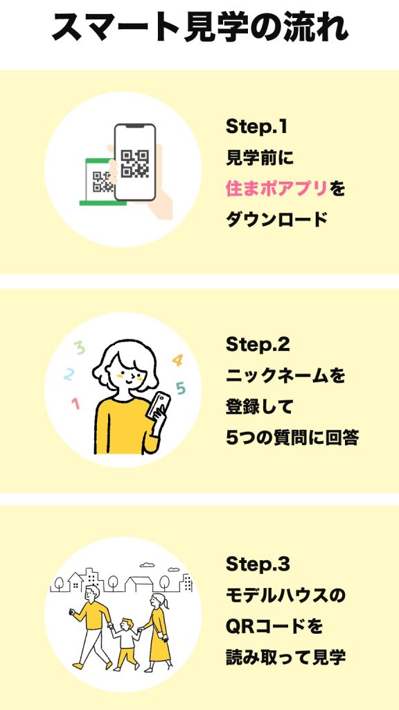 住まポを使えば、モデルハウスの入り口で毎回アンケートに答える必要はありません。見学前に住まポアプリをダウンロードして、モデルハウスにあるQRコードを読み込むだけで見学OK!