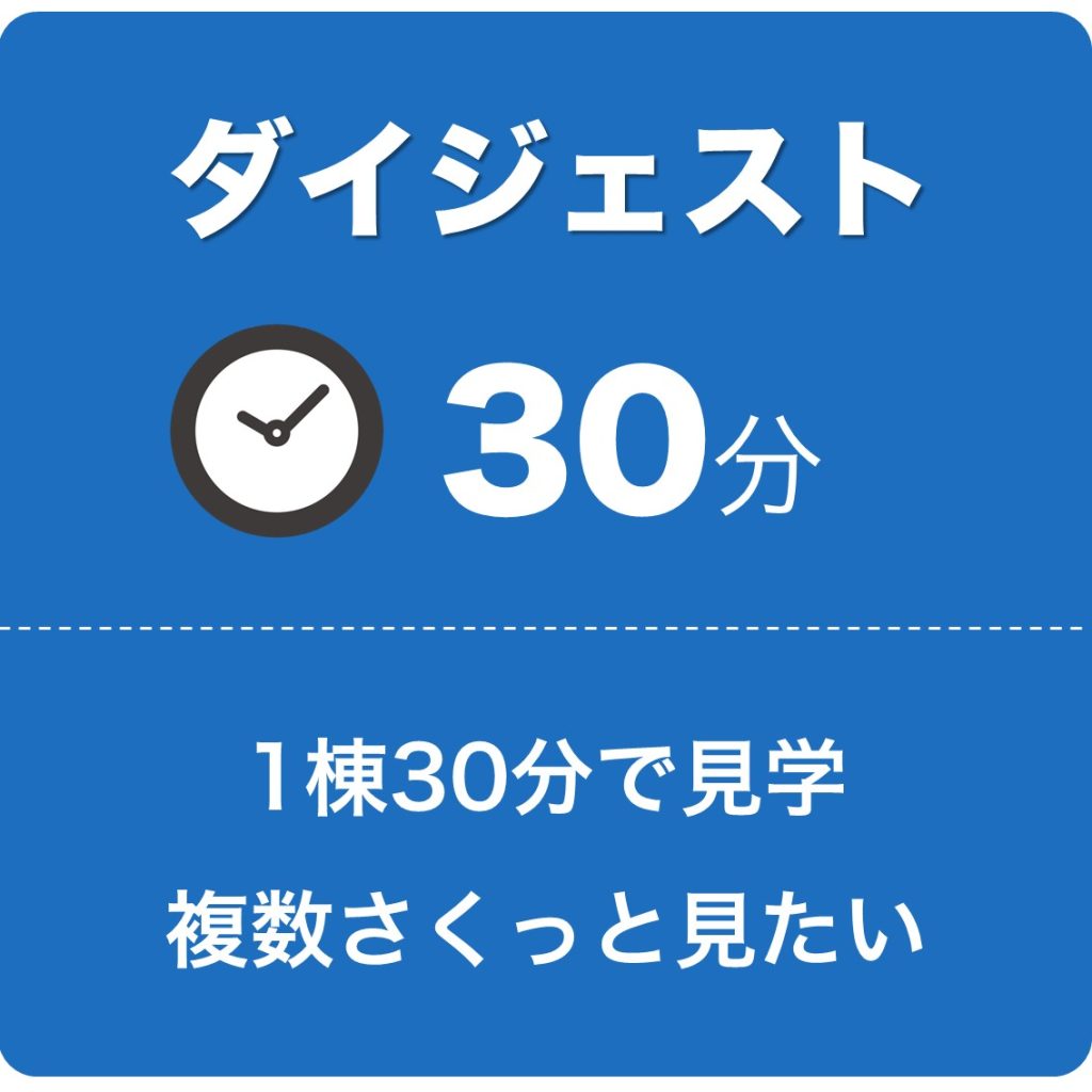 30分で1棟見学!最大で4棟まで一気に見学できる「ダイジェスト見学プラン」、1棟をじっくり見学する「じっくり見学プラン」2つの見学プランをご用意しています。