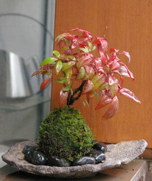 お正月らしい縁起木を使った苔玉を作製
