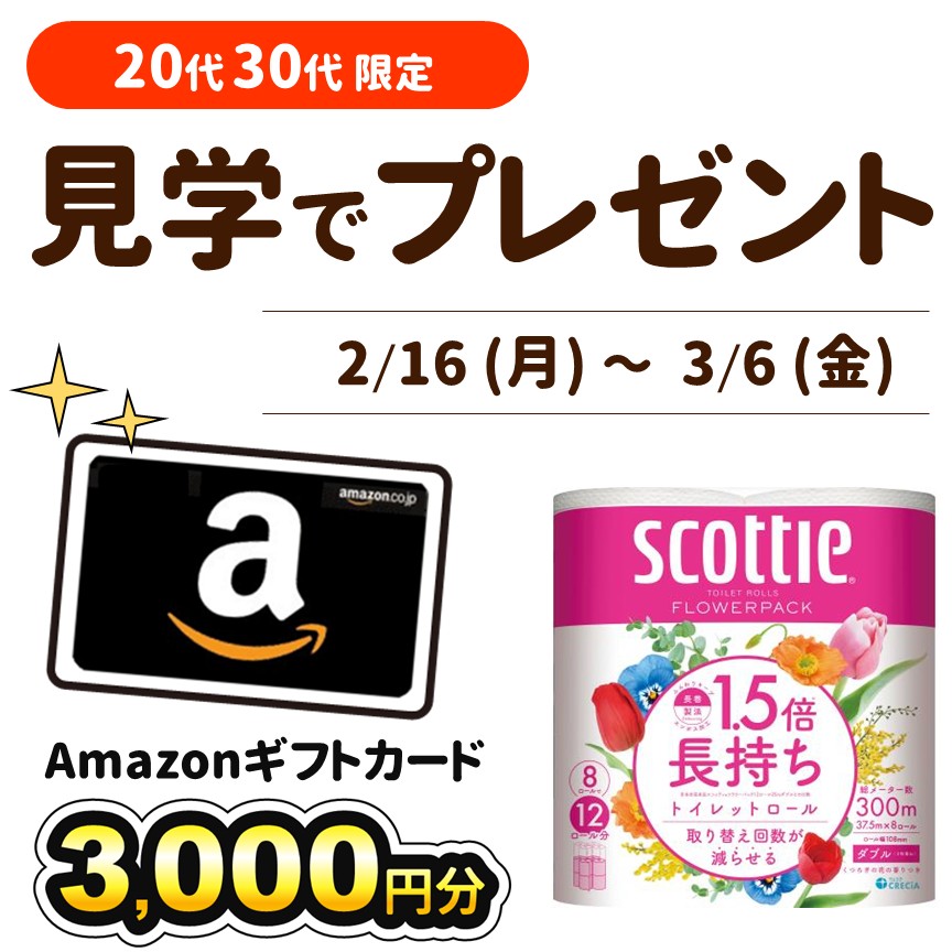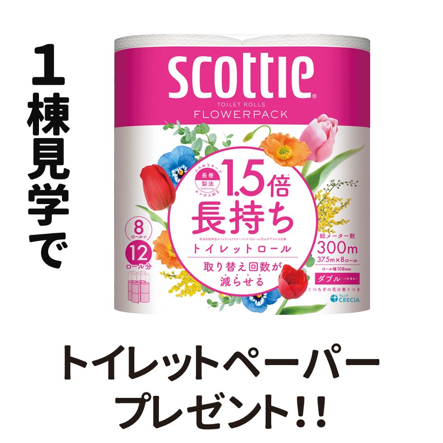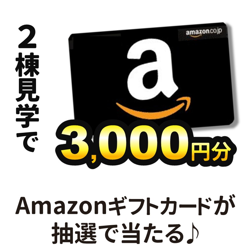 1棟見学で、8ロール入りトイレットペーパーをもれなくプレゼント!さらに、もう1棟見学でAmazonギフトカードが抽選で当たります。