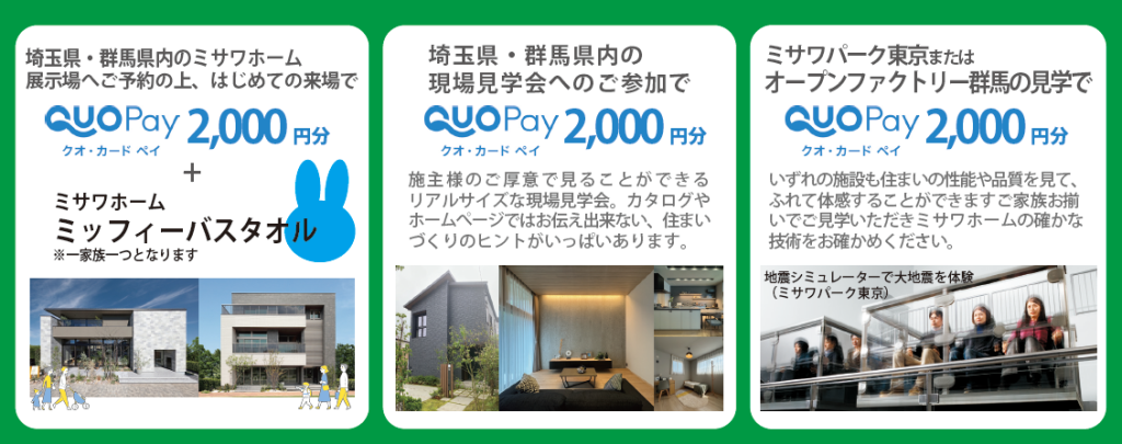 さらに、③ ミサワパーク東京またはミサワオープンファクトリー群馬のいずれかの見学会へのご参加で2,000円分のQUOカードPayを差し上げます。