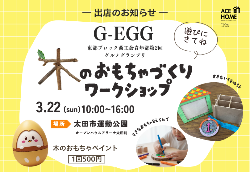 3月22日(日)、太田市運動公園(オープンハウスアリーナ太田前)で開催される地域イベント 「G-EGG」 に、当社がワークショップで出店します!色ぬり&シール貼りで“世界にひとつ”のおもちゃが作れます。完成品はお持ち帰りOK。