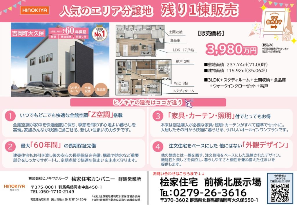 【桧家住宅】人気エリア戸建分譲 残り1棟! 北群馬郡吉岡町大久保