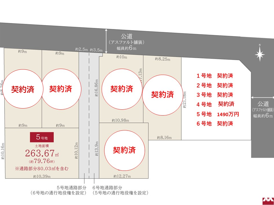 ※6号地通路部分79.79㎡に5号地の通行地役権を設定します。