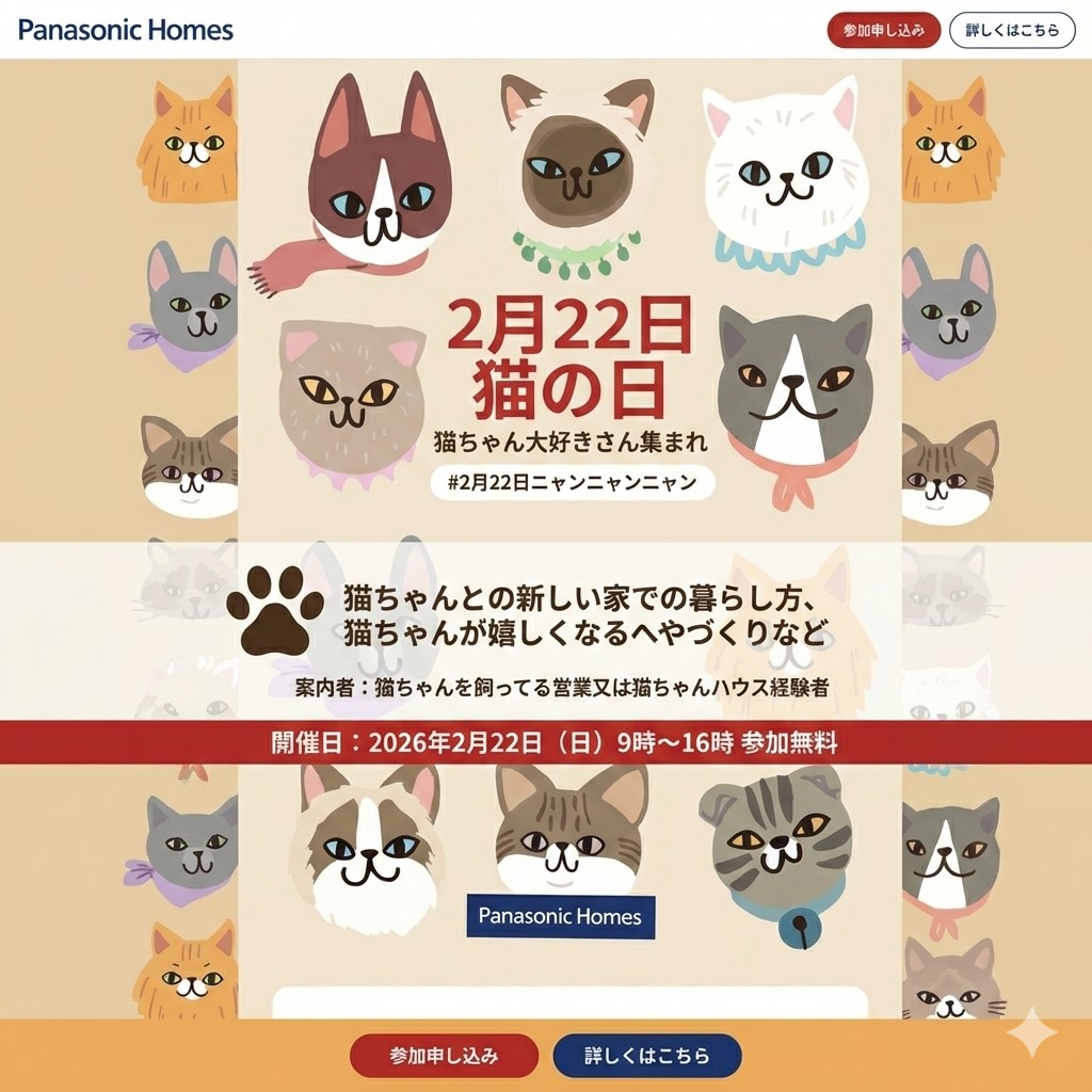今年の「猫の日」はパナソニックホームズで猫も人も、もっと心地よく笑える暮らしのヒントを見つけに来ませんか?