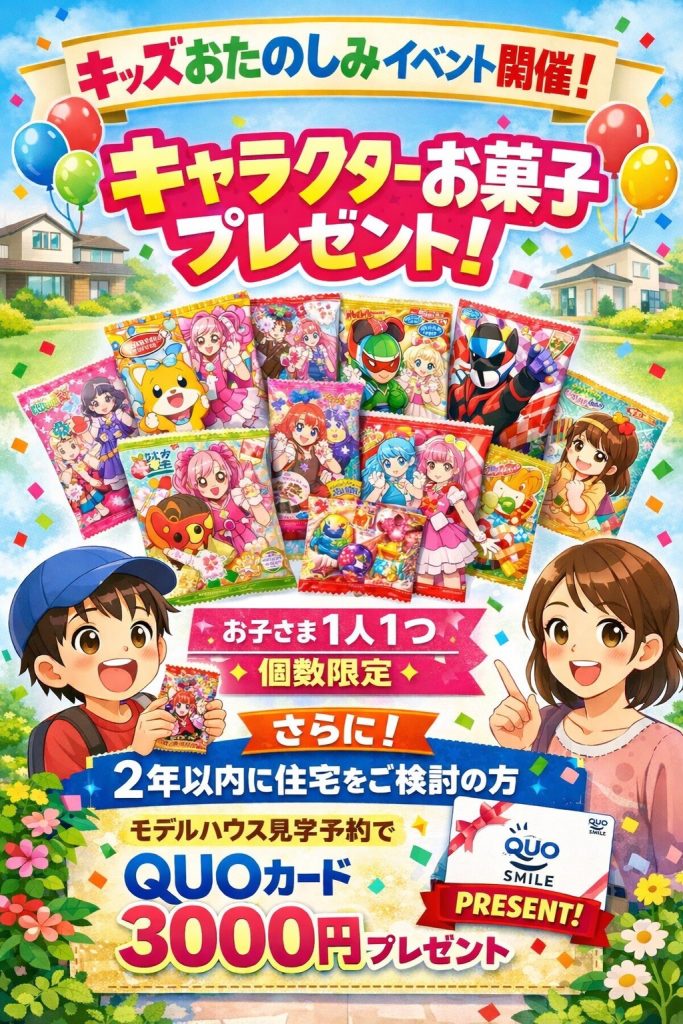 パナソニックホームズでは、キャラクター菓子をご来場者お子様1人につき1つお菓子をプレゼント!個数限定でご用意。